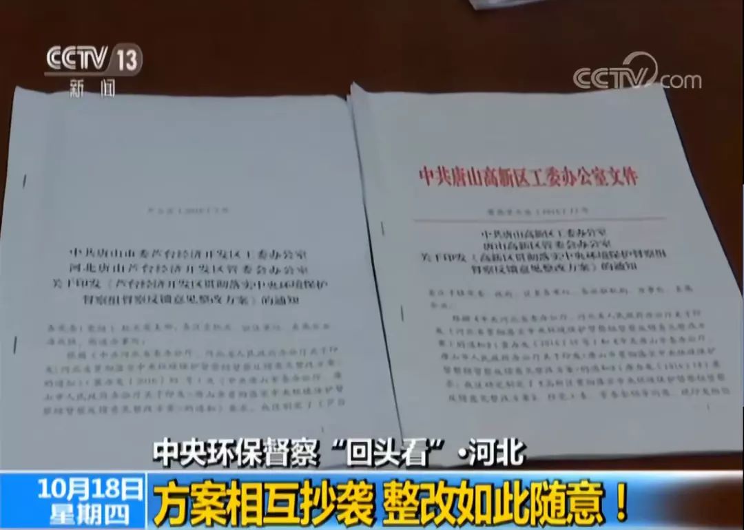 两份文件,都是从“指导思想”、“工作目标”、“主要措施”、“组织保障”四部分分别阐述,而且每部分又大都套着大(一)、(二)、(三)、(四),小1、2、3、4不等,里面的大小标题完全一样,内容表述除极个别有差异外,其它全都高度一致。芦台经济开发区和高新区分别处于唐山市一南一北两个位置,区域有差异,工业结构和整改问题也各有区别,然而在这两份整改方案上,却并没有体现出这些不同,反而在思想和行动上表现出了惊人的“神同步”! 生态环境部华北督察局督察三处干部姜维:都是针对共性问题制定出的方案,没有针对自身的环境问题制定有针对性的方案,这个就说明地方在部署工作中,他这个工作部署不严不实。 整改方案照抄照搬为哪般? 两个地方的整改方案,却出现一样的内容,为什么会出现这种情况呢?前不久,记者赶到唐山市芦台经济开发区和高新区进行调查。 在芦台经济开发区,管委会副主任赵国林调查后认为,之所以会有这样的现象,是因为当时没有专题的治污目标,基层同志在接到任务后,直接套用了唐山市下发的文件。 唐山市芦台经济开发区管委会副主任赵国林:我们是拿唐山的套的,因为基层做工作,有时候他忙于具体事务,各种督察、各种检查、各种现场的巡视,突然地领导要求上报,有可能就在办公室拿着套一下。